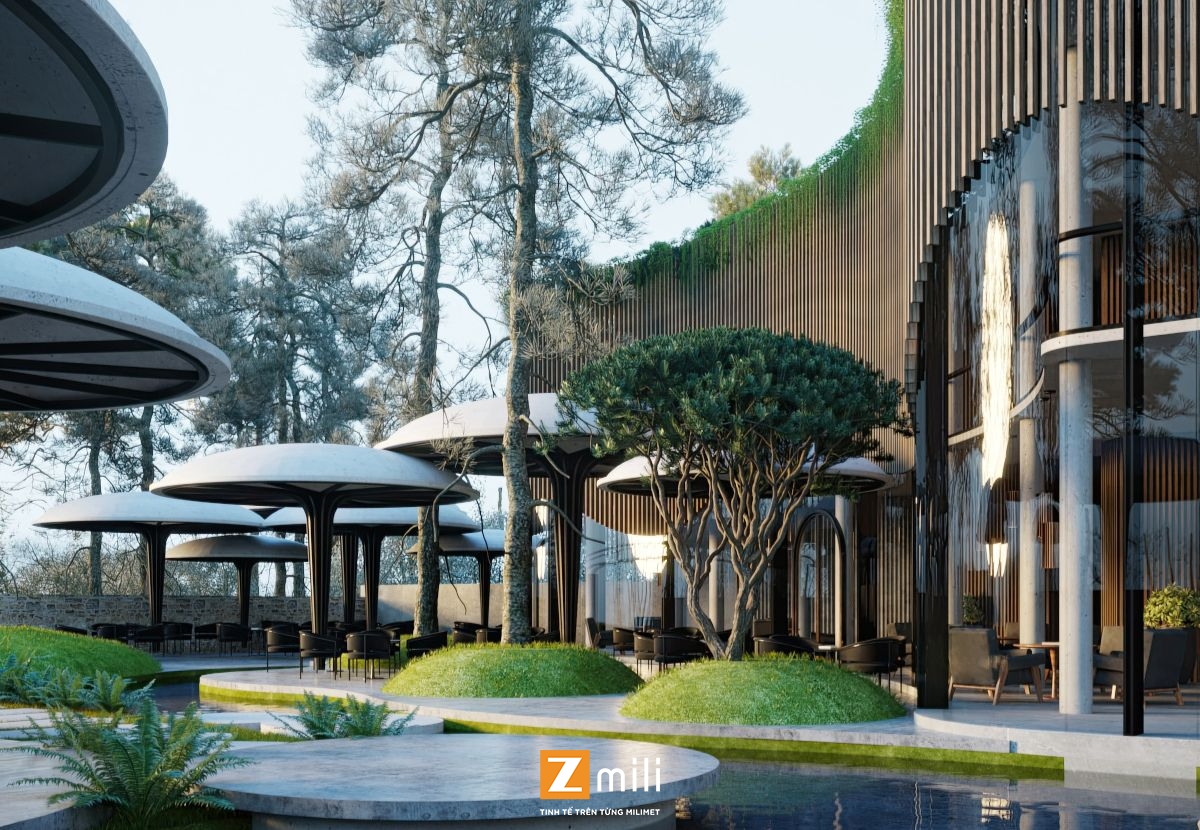 Điểm đặc sắc không chỉ dừng lại ở bên trong. Tận dụng lợi thế khu đất rộng, Zmili đã thiết kế không gian ngoại thất đầy ấn tượng với những chòi nghỉ/khu vực ngồi ngoài trời có hình dáng như những cây nấm khổng lồ độc đáo. Những "cây nấm" này không chỉ tạo bóng mát mà còn là điểm nhấn kiến trúc lạ mắt, hòa quyện vào khu vườn được quy hoạch với cây xanh, thảm cỏ và lối đi uốn lượn, tạo nên một khung cảnh tựa như trong truyện cổ tích hay một "thiên hà" thu nhỏ. Có một sự đối thoại thú vị giữa hình khối cong mềm mại bên trong và các cấu trúc hữu cơ bên ngoài.