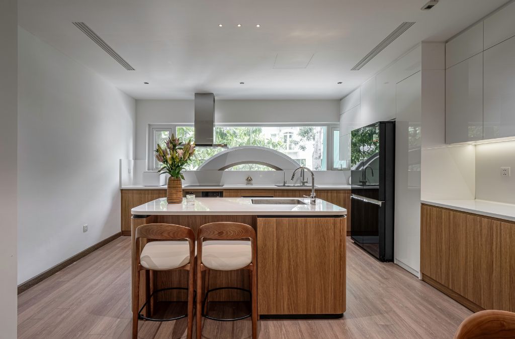 Điểm đặc biệt của khu bếp trong dự án Phố Trúc là tầm nhìn hướng ra mảng xanh của Ecopark. Zmili tận dụng lợi thế cảnh quan này bằng cách mở rộng diện tích cửa kính, để ánh sáng tự nhiên trở thành “nguồn năng lượng” chính của không gian.