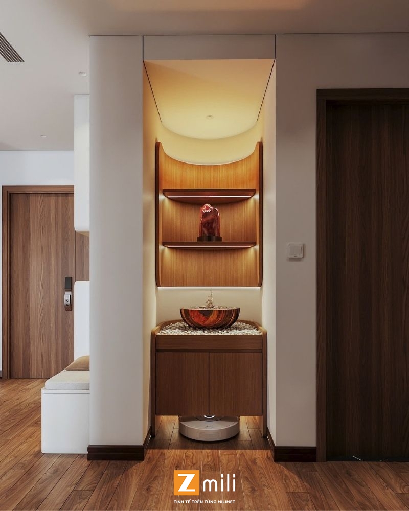 Ánh sáng là điểm nhấn quan trọng. Zmili sử dụng ánh sáng vàng ấm, đèn hắt khe, tạo độ sâu tự nhiên và cảm giác “cozy” đúng mong muốn của gia chủ. Mỗi tối bước về nhà, căn hộ như dịu lại.