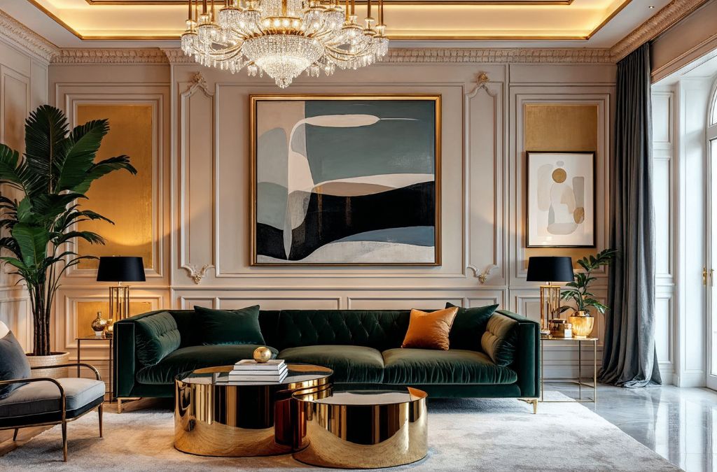 Mẫu 1: Đèn chùm pha lê, sofa nhung xanh rêu, bàn trà mạ vàng, tường phào chỉ và gương lớn, kết hợp tranh nghệ thuật hiện đại.