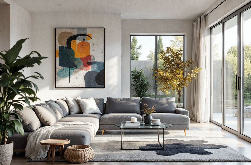 Mẫu 1: Sofa dài màu xám than, bàn kính trong suốt, tranh trừu tượng trên tường, cửa kính lớn đón ánh sáng tự nhiên, tích hợp loa ẩn và đèn LED điều chỉnh.