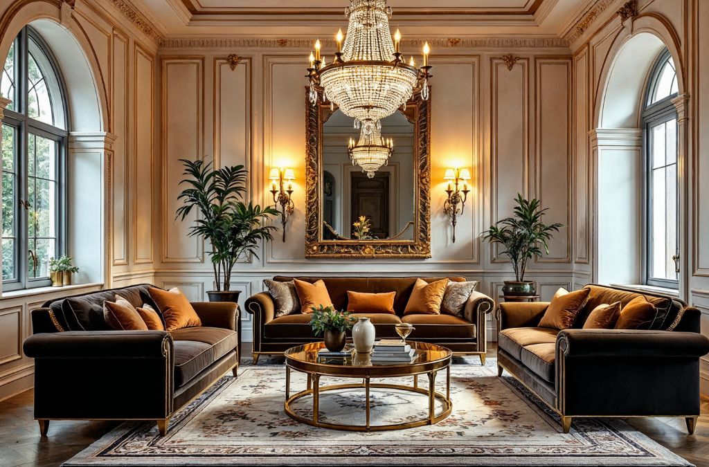Tân Cổ Điển: Sofa bọc nhung, họa tiết tinh xảo, tông màu đậm như xanh rêu, đỏ đô.