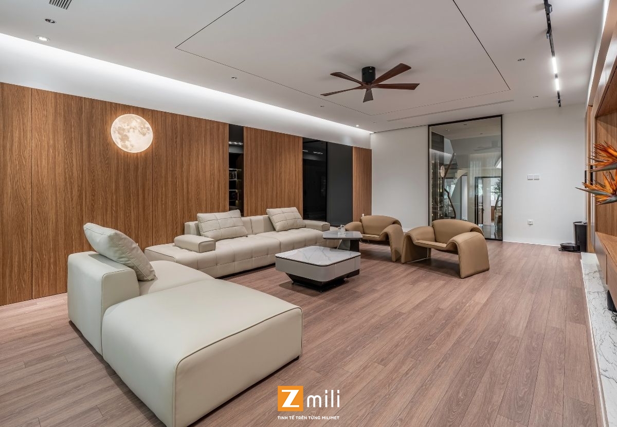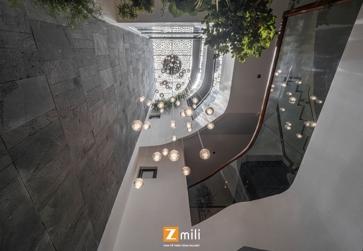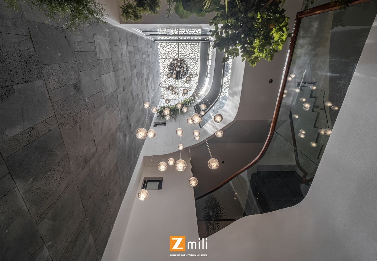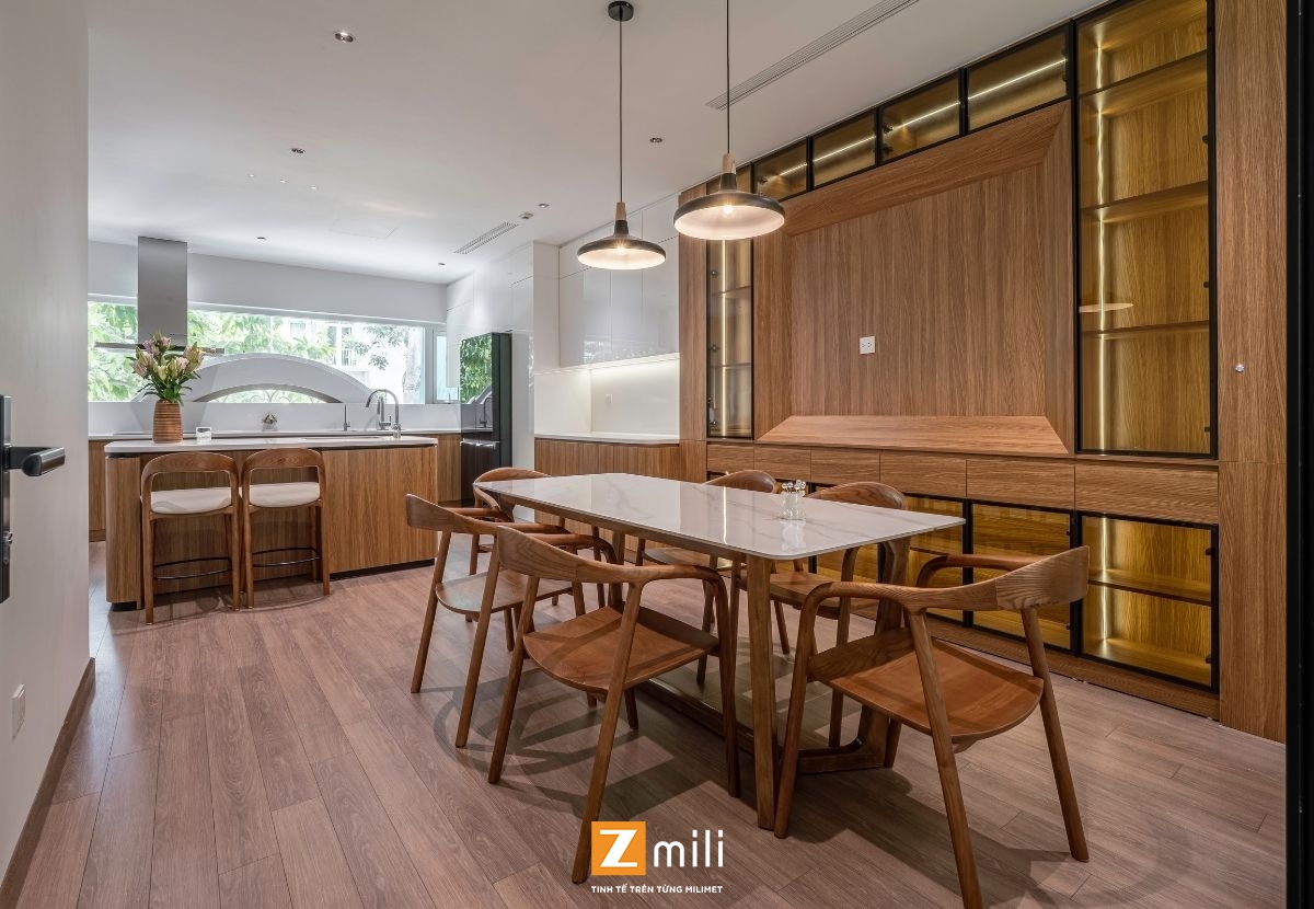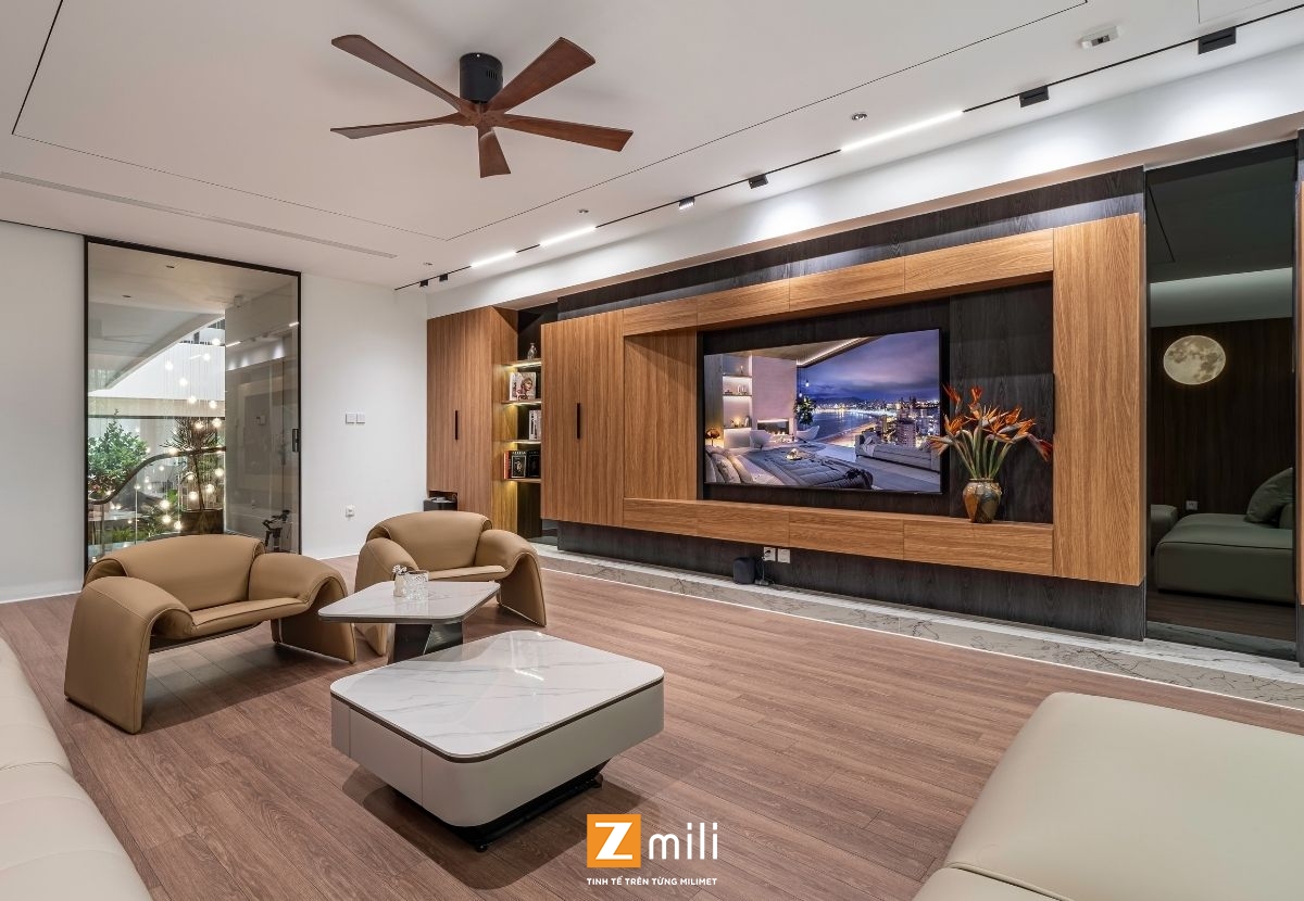 Với kiến trúc thông tầng là điểm nhấn, công trình đón sáng và gió tự nhiên len lỏi vào từng góc nhỏ trong nhà. Nội thất mang phong cách hiện đại, thanh lịch với sự kết hợp hài hòa giữa các tông màu ấm, trung tính và vật liệu gỗ tự nhiên. Mỗi tầng là một không gian sống chỉn chu và tiện nghi: phòng khách thư giãn với hệ sofa lớn và màn hình giải trí; bếp và bàn ăn kết nối mở, thoáng đãng; phòng ngủ tinh giản nhưng đầy đủ tiện nghi; không gian thờ và làm việc riêng biệt, yên tĩnh.