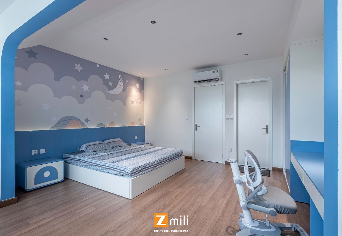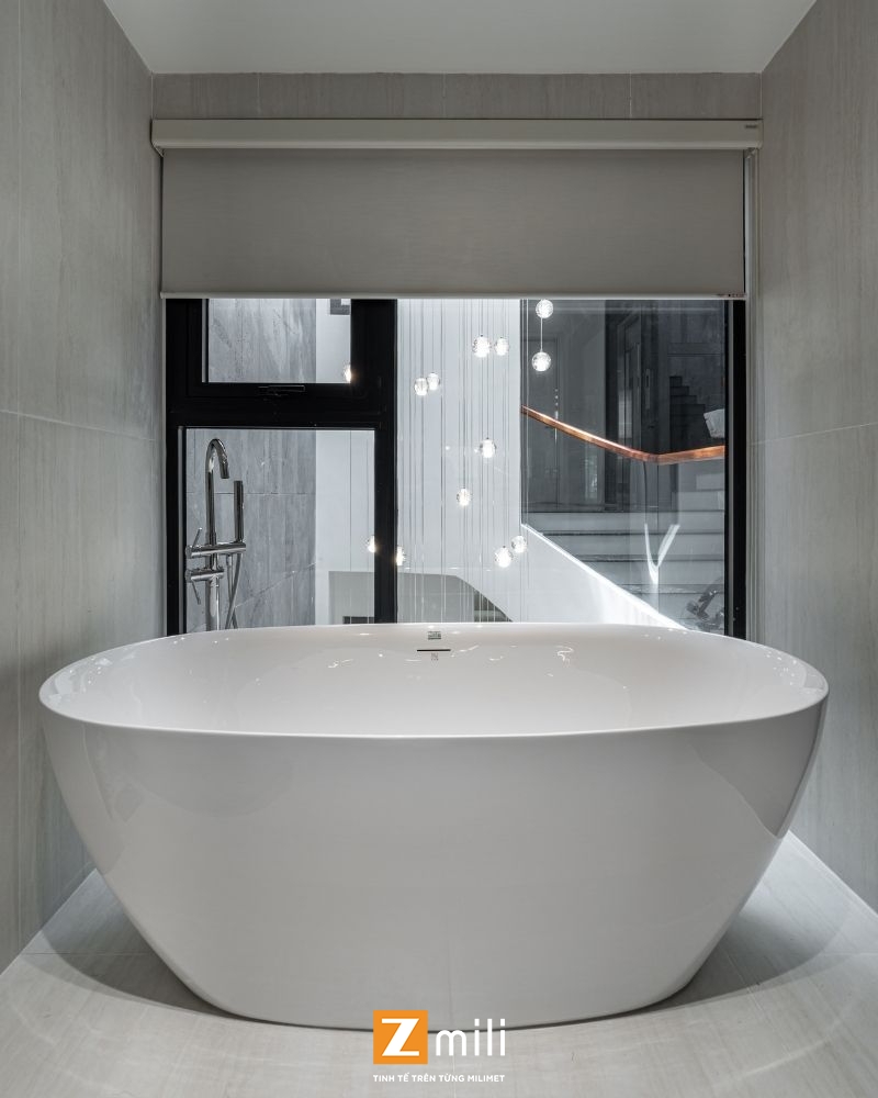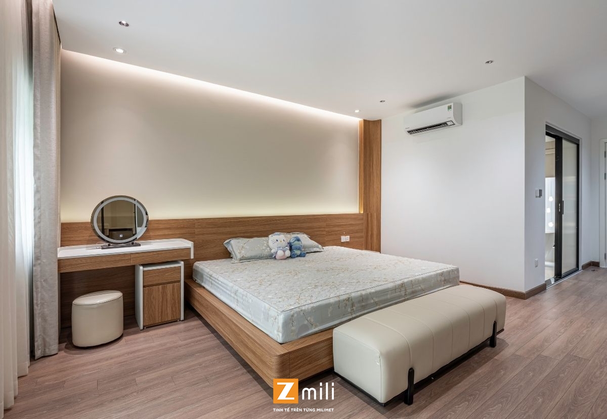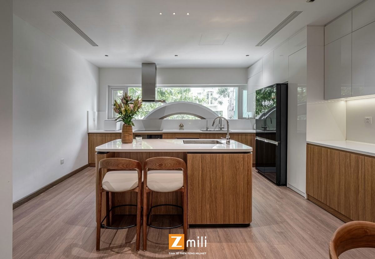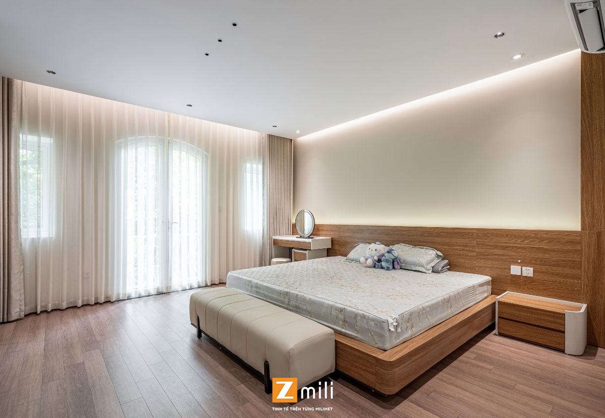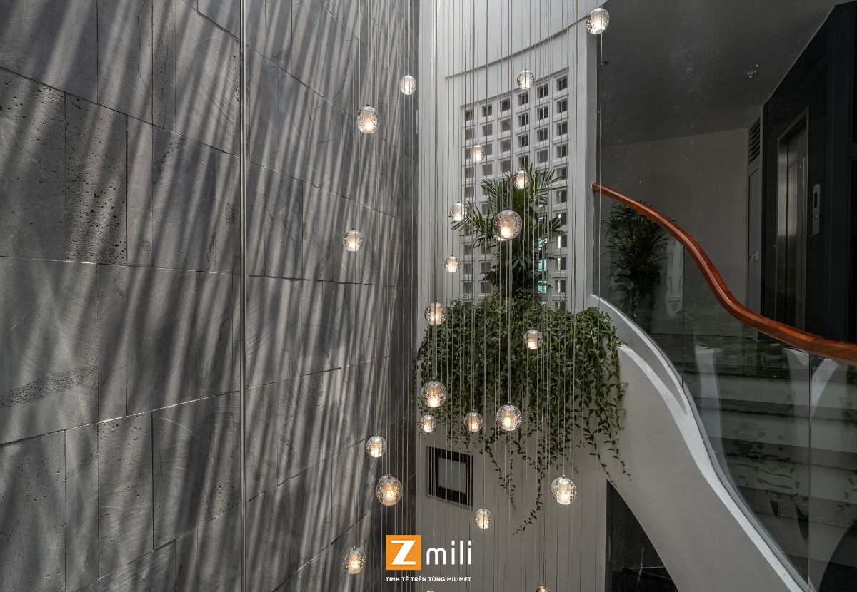 Với kiến trúc thông tầng là điểm nhấn, công trình đón sáng và gió tự nhiên len lỏi vào từng góc nhỏ trong nhà. Nội thất mang phong cách hiện đại, thanh lịch với sự kết hợp hài hòa giữa các tông màu ấm, trung tính và vật liệu gỗ tự nhiên. Mỗi tầng là một không gian sống chỉn chu và tiện nghi: phòng khách thư giãn với hệ sofa lớn và màn hình giải trí; bếp và bàn ăn kết nối mở, thoáng đãng; phòng ngủ tinh giản nhưng đầy đủ tiện nghi; không gian thờ và làm việc riêng biệt, yên tĩnh.