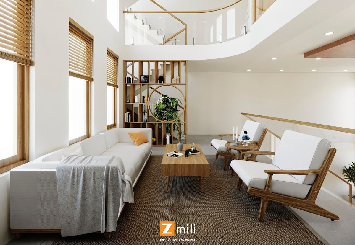 Điểm "ăn tiền" nhất của công trình chính là khu vực phòng khách với khoảng thông tầng cao vút, giúp kết nối tầm nhìn giữa các tầng và đón trọn ánh sáng tự nhiên. Nội thất sử dụng tông màu trắng chủ đạo kết hợp với gỗ sồi sáng màu và sofa đệm nỉ êm ái, mang lại cảm giác nhẹ nhàng, thư thái đậm chất "chữa lành".