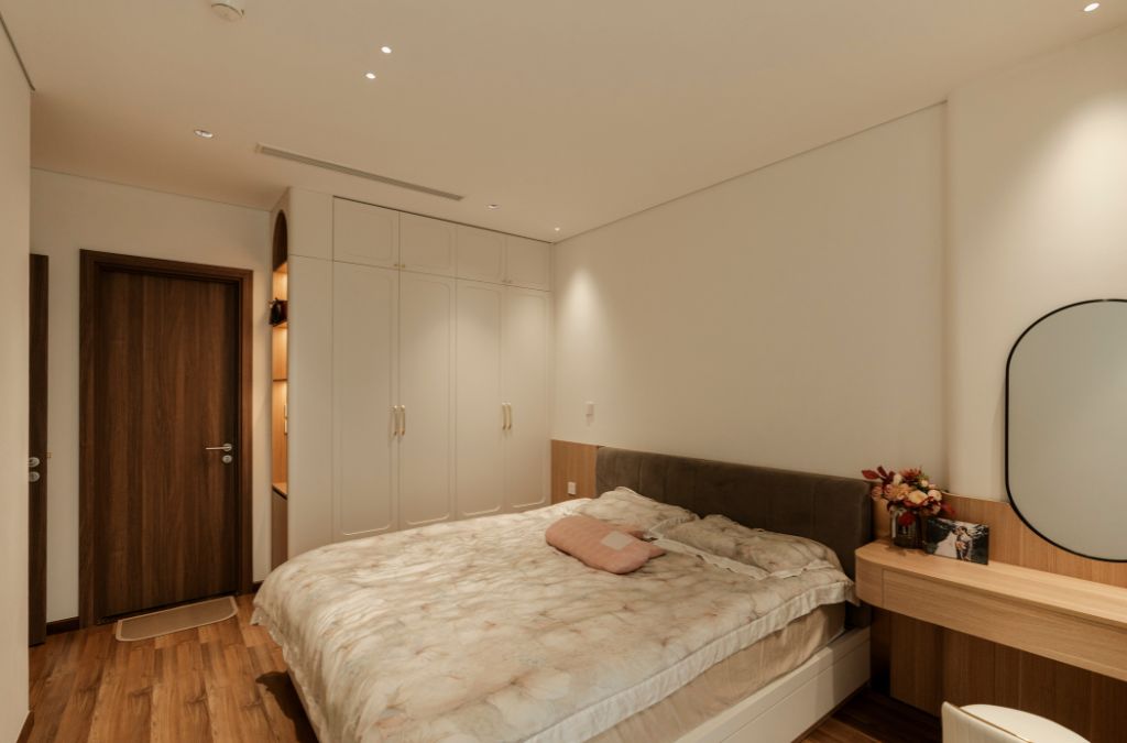 Phòng ngủ Master là sự kết hợp giữa vải dệt cao cấp, ánh sáng âm trần nhẹ nhàng và hệ gương trang trí độc đáo. Đặc biệt, sự xuất hiện của các chi tiết nhỏ như tay cầm tủ bằng kim loại màu đồng hay hệ đèn trang trí tại kệ sách đã góp phần định nghĩa chất "Luxury" một cách thầm lặng nhưng đầy lôi cuốn.