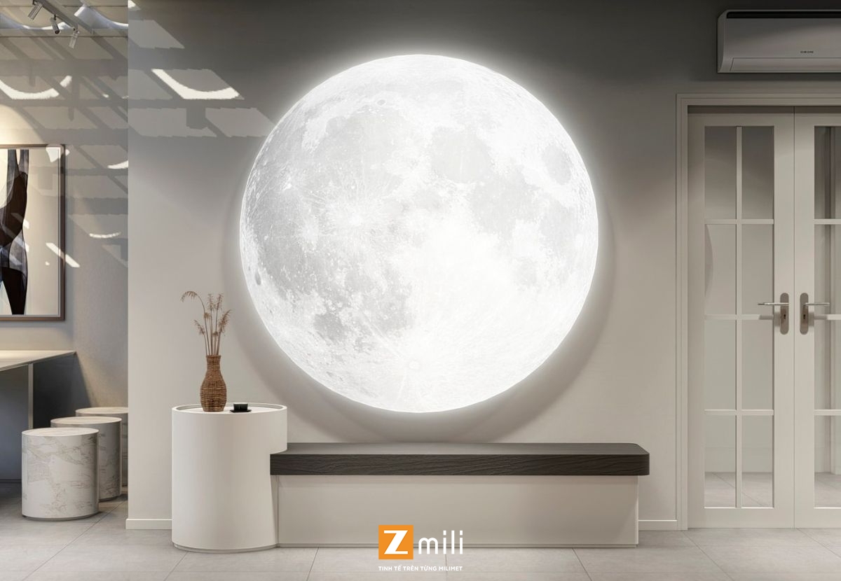 Điểm nhấn "Mặt Trăng": Ấn tượng mạnh mẽ nhất của tiệm tranh chính là chiếc đèn trang trí hình Mặt Trăng khổng lồ phát sáng ngay tại khu vực sảnh chờ. Chi tiết này không chỉ cung cấp ánh sáng dịu nhẹ mà còn tạo nên một bầu không khí huyền ảo, thơ mộng, hứa hẹn là góc check-in "triệu like" cho bất kỳ ai ghé thăm.